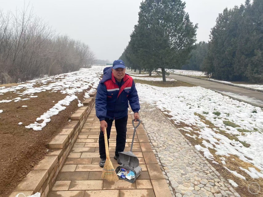 秦始皇陵考古名胜公园(丽山园)东城墙,使命主谈主员焦师父正在清扫大地。
