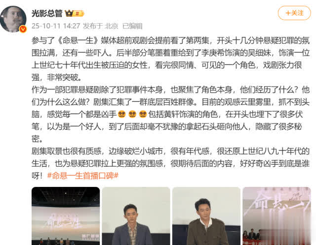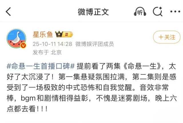 现场媒体不少,看完两集,他们也称,2025年悬疑剧宽敞,却莫得一部的确的爆款,《命悬一生》可能会是本年第一部拉爆的悬疑剧。