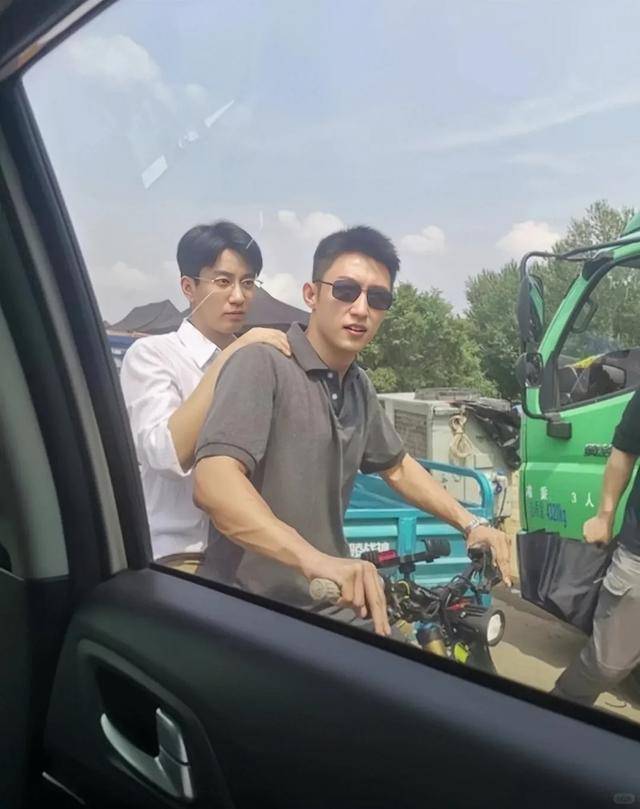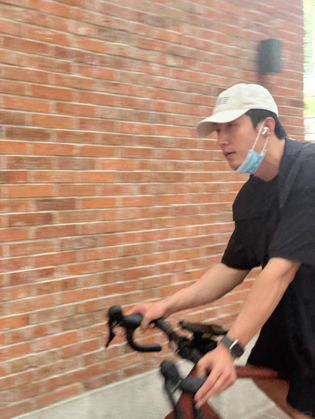 还有拍戏时,他骑个自行车就出来了,衣着棕色短袖、戴着墨镜,胳背上的青筋极端杰出。