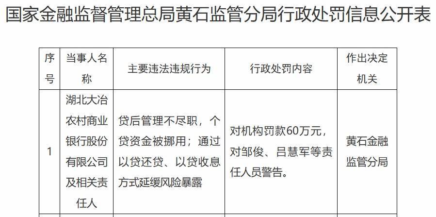 【大河财立方音问】10月25日音问,国度金融监督责罚总局黄石监管分局行政处罚信息公开表娇傲,因贷后责罚不遵法,个贷资金被挪用;通过以贷还贷、以贷收息样貌减慢风险显现,湖北大冶农村生意银行股份有限公司被罚60万元。